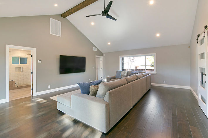 To workaround the lot setback, we created a new family room and guest suite addition on the side of the home. There’s also access to a bathroom from outside. Inside, sliding barn doors separate the new addition from the dining room, keeping the whole space open.
